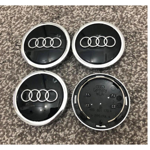 FULL SET 4x BRAND NEW CENTRE CAPS FOR AUDI 69MM BLACK/CHROME. TO FIT ALL GENUINE AUDI WHEELS WITH 69MM OUTER DIAMETER (56mm clip size).